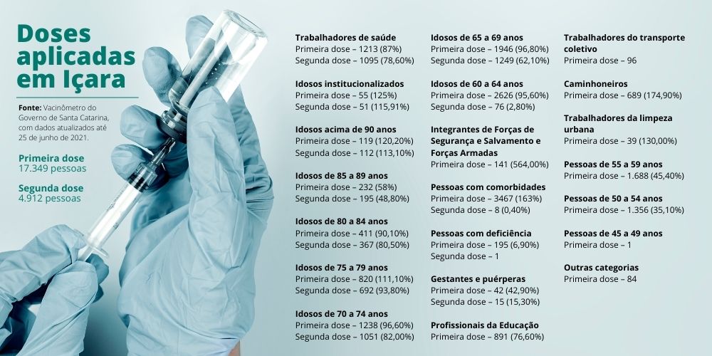 Conforme os dados do Vacinômetro do Governo de Santa Catarina, atualizados até a manhã desta sexta-feira, Içara contabiliza 22.261 aplicações da vacina contra a covid, sendo 17.349 primeiras doses e 4.912 segundas doses.