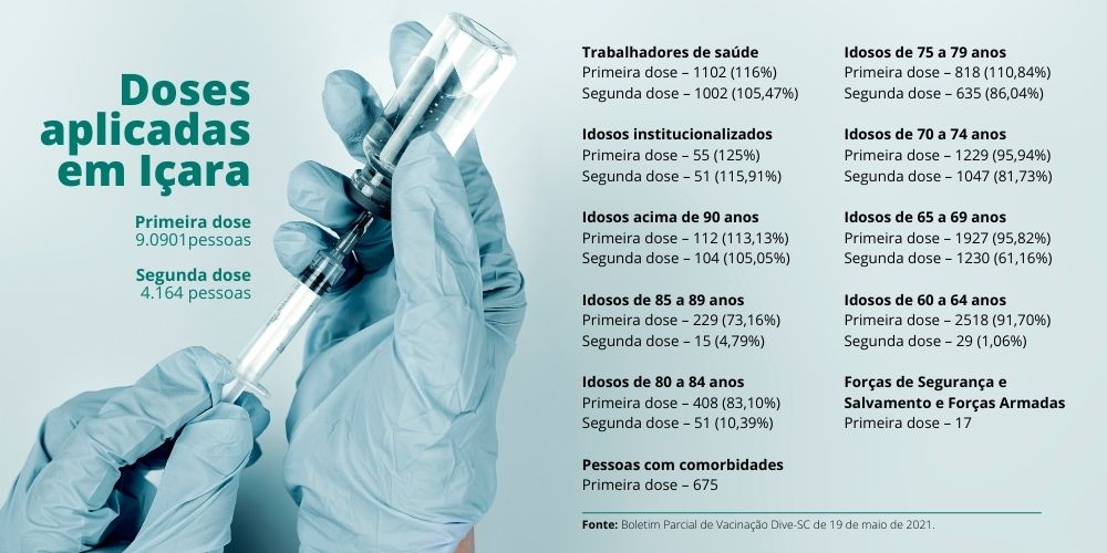 Os números são do boletim parcial de vacinação divulgado pela Diretoria de Vigilância Epidemiológica do Estado (Dive/SC) na quarta-feira, dia 19. O balanço mostra que até o momento 4.164 içarenses já receberam a segunda dose, o equivalente a 34,21% do total estimado, enquanto 9.090 tomaram a primeira dose, representando 74,69% e 519 a mais em comparação com a semana anterior.