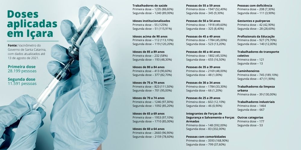 Içara deve fechar a semana com mais de 40 mil aplicações da vacina contra o coronavírus. Até o momento, 28.199 içarenses receberam a primeira dose, sendo que 11.591 já tomaram também a segunda dose do imunizante, totalizando 39.790 aplicações. Os dados são do Vacinômetro do Governo de Santa Catarina, atualizados até esta sexta-feira, dia 13. Em relação à semana passada, foram mais 2.779 aplicações da primeira dose e 572 da segunda. Nesta semana, o município recebeu 4.077 doses e pôde baixar a faixa etária da população a ser imunizada.
