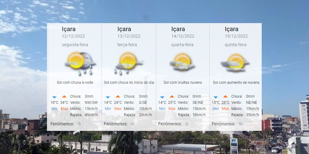 A temperatura vai aumentar ainda mais nesta segunda-feira, dia 12. Para Içara, o Centro de Informações de Recursos Ambientais e de Hidrometeorologia de Santa Catarina aponta até 34°C nos termômetros oficiais. Será o ápice da semana. E, tipicamente à proximidade com o verão, poderá ter chuva a noite com volumes baixos. Acompanhe o detalhamento: