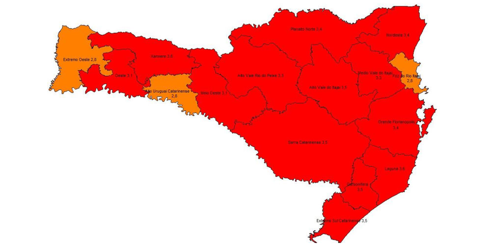 A Região Carbonífera regrediu ao pior nível na matriz de risco potencial de covid-19 nesta quarta-feira, dia 25. Junto com outras 12 regiões, figura agora com a classificação gravíssima. Apenas o Extremo Oeste, Alto Uruguai e Foz do Rio Itajaí aparecem em nível inferior em Santa Catarina, mas ainda grave. A mudança representa restrição total a eventos sociais, parques aquáticos e complexos termais, de qualquer evento esportivo presencial privado e da Fesporte; além da redução da ocupação de academias, templos religiosos e hotéis a 30%.