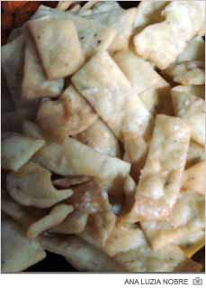 MODO DE PREPARO: Coloque o sal ao seu gosto e misture todos os outros ingredientes com o trigo até quando a massa já estiver no ponto de esticar. Abra com o rolo até ficar fina. Corte e frite em óleo quente, fogo baixo, pois assim fritam mais rápido. Se quiser pode colocar tempero seco. Uma dica é usar orégano. Para dobrar a massa, basta multiplicar igualmente os ingredientes.