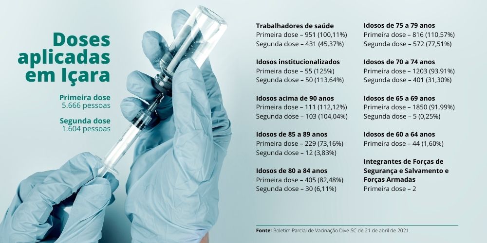Com remessas semanais de vacinas, a imunização contra o coronavírus avança em Içara, tendo como foco no momento a aplicação da segunda dose. Na comparação entre o boletim parcial divulgado na semana passada pela Diretoria de Vigilância Epidemiológica do Estado (DIVE-SC) e o da última quarta-feira, dia 21, mais 578 içarenses receberam o complemento do imunizante, aumentando o percentual para 18,49% do total estimado dos grupos prioritários na atual fase da campanha de vacinação.