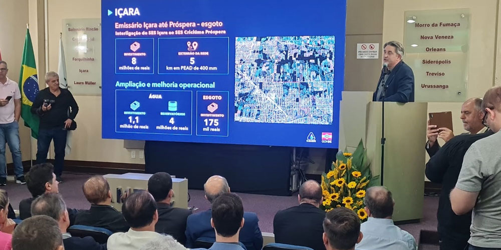 O pacote da Casan para a cidade foi apresentado pelo governador Jorginho Mello (PL) em visita a Associação dos Municípios da Região Carbonífera (Amrec) na manhã desta quinta-feira, dia 18, sobre o programa Santa Catarina Levada a Sério + Perto de Você. “Já tivemos em Xanxerê, Chapecó e agora chegamos ao Sul de Santa Catarina. Minha conversa tá sendo olho no olho com cada um dos prefeitos. Eu quero saber a real necessidade de investimentos para cada região, por isso estamos rodando o Estado”, reforça o governador.