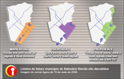 Uma discussão polêmica voltou a ganhar espaço nos noticiários da região: a emancipação do Balneário Rincão. Ou melhor, a iniciativa de jovens, entidades e lideranças políticas para modificar o mapa do que seria o novo distrito ou mesmo impedir sua independência administrativa. O conceito inicial é que, de acordo com o mapa que foi desenhado antes do processo seletivo, Içara ficaria sem nenhuma ligação com o mar, e não teria autoridade nenhuma sobre a Lagoa do Faxinal, de onde é captada parte da água consumida no município.