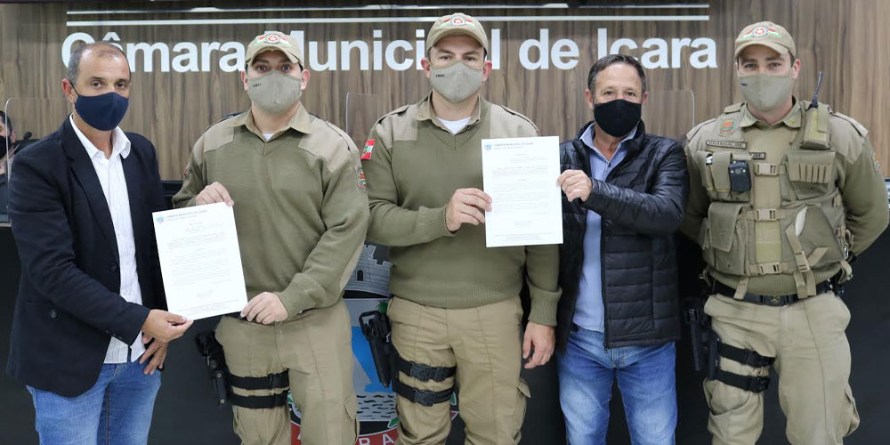 Os policiais militares Emerson Nunes Vieira e Janquiel Pereira receberam congratulações por ato de bravura nesta terça-feira, dia 3. A homenagem concedida pela Câmara Municipal, sob autoria do vereador Jairo Manoel da Silveira, o Jairinho (PSD), ocorreu devido ao salvamento de uma mulher no Balneário Rincão. No último dia 12 de julho, os soldados já haviam recebido moções do legislativo içarense também pelo salvamento de uma jovem no centro de Içara. O vereador Moacyr Francisco, o Cisquinho (PSD), e comandante da 1ª Companhia da Guarnição Especial de Içara, Fausto Brandalise, acompanharam a entrega.