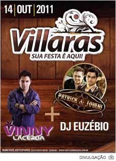 A festa não pára. Nesta sexta-feira, dia 14, será a vez de Vinny Lacerda, Patrick & Jovani, além de DJ Euzébio agitarem o Villaras. Os ingressos antecipados já estão disponíveis. Aos interessados na balada que acontecerá na margem da SC-444, as entradas estão à venda no Auto Posto Nicão, no Centro de Içara. Os bilhetes custam R$ 20 aos homens e R$ 10 para as mulheres.