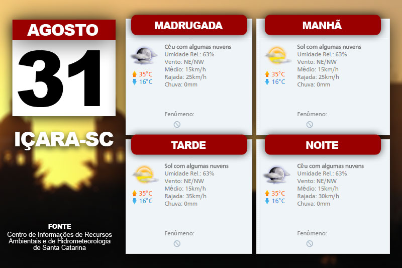 O tempo firme com Sol e algumas nuvens em todas as regiões do estado decorre da atuação de uma massa de ar seco nesta segunda-feira. A temperatura segue ainda elevada para época do ano à tarde, acima de 30ºC no Litoral. “Umidade baixa no período da tarde, em torno de 30 a 40% no Oeste, Meio Oeste e Planalto Sul. Vento de noroeste a nordeste, fraco a moderado, com rajadas”, aponta também a meteorologista do Centro de Informações de Recursos Ambientais e de Hidrometeorologia de Santa Catarina, Gilsânia Cruz.