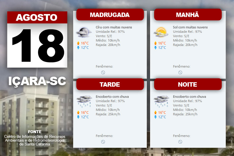 O risco de temporais isolados vale também para esta quinta-feira com intensas rajadas de vento e possibilidade de granizo. No litoral, a chuva ocorre nos períodos da tarde e noite. O Centro de Informações de Recursos Ambientais e de Hidrometeorologia de Santa Catarina indica ainda temperatura em declínio.