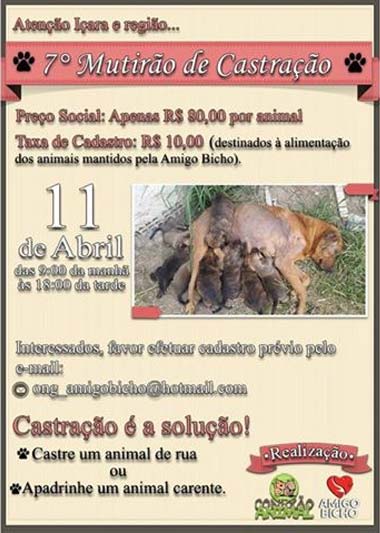 O sétimo Mutirão de Castração da Amigo Bicho será realizado em parceria com a Clínica Veterinária Conexão Animal no próximo sábado, dia 11. O cadastro já está inclusive aberto. A ficha de inscrição e as orientações devem ser requisitadas pelo e-mail ong_amigobicho@hotmail.com. O custo será de R$ 80 para o procedimento cirúrgico e mais R$ 10 para ajudar a entidade na alimentação dos animais recolhidos nas ruas.