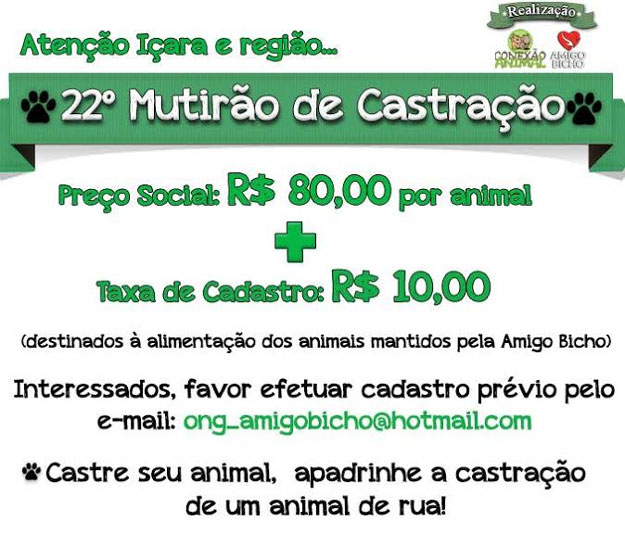 O próximo mutirão de castração da Associação Amigo Bicho será das 9h às 18h do dia 10 de setembro. As inscrições para a 22ª edição já podem ser realizadas através do e-mail ong_amigobicho@hotmail.com. Cada cirurgia custará R$ 90 independente do tamanho ou animal (cão/gato). Desse valor, R$ 10 será destinado à alimentação e tratamento dos bichinhos mantidos pela entidade.