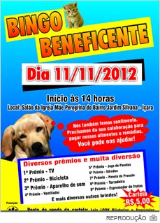 A Associação Amigo Bicho vai promover um bingo beneficente para arrecadar recursos e manter o atendimento aos animais abandonados. O evento acontecerá a partir das 14h de 11 de novembro. Será no salão da capela Mãe Peregrina, no Jardim Silvana.