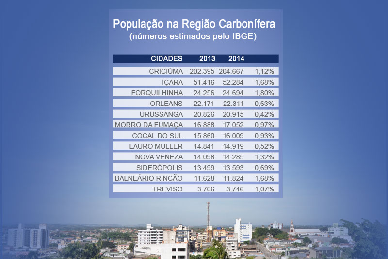 Entre 2013 e 2014, a maior proporção de crescimento populacional na região carbonífera foi de Forquilhinha. O município passou de 24,2 mil para 24,6 mil habitantes. Isto significa um avanço de 1,80%. Içara apresentou uma taxa de 1,68%. Já o Rincão ficou em terceiro com desvantagem mínima diante do município-mãe. As três primeiras posições da lista seguem o mesmo ranking do último ano. A diferença é que os percentuais agora foram menores. Içara, por exemplo, teve uma queda de 2,74 pontos.