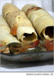 RECHEIO: Pique a cebola, o pimentão e o tomate e refoque numa frigideira ou panela untada. Se quiser, utilize a criatividade para incrementar ainda mais. Pode colocar, por exemplo, orégano. Após pronto, passe um pouco de mostarda na massa e coloque o recheio. Em seguida, feche a panqueca e sirva-se.