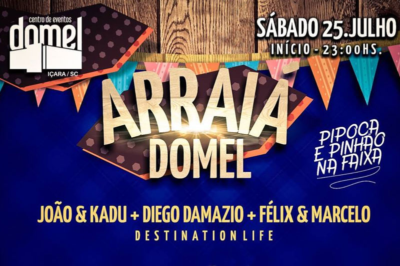 João & Kadu, Diego Damazio, além de Felix & Marcelo comandarão o ritmo do Arraiá Domel neste sábado, dia 25. A balada no Centro de Içara terá também pipoca e pinhão na faixa. O acesso será liberado para quem comparecer vestido com traje jeca a partir das 23h. Com nome na lista, as mulheres também entrarão gratuitamente. Já os homens pagarão R$ 10. Para garantir o desconto basta enviar os dados pelo aplicativo Watsapp pelo telefone (48) 9148-7349.