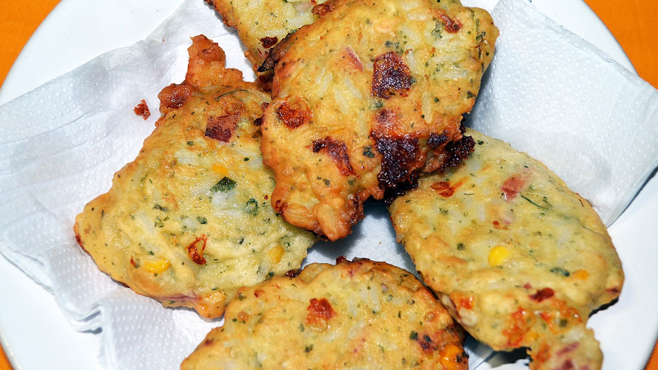Separe quatro colheres grandes de arroz, milho verde, presunto, queijo prato, tempero verde, três ovos mexidos, uma xícara de leite, farinha de trigo (até dar liga) e óleo. Confie em seu talento e reinvente a receita.
