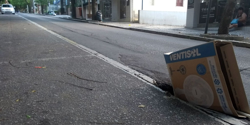 O asfalto na Rua Marcos Rovaris voltou a ceder e abriu uma cratera de aproximadamente 50cm no trecho entre as ruas Duque de Caxias e Ipiranga, no Centro de Içara. A falha na pavimentação ocorreu no limite da pintura de uma das vagas de estacionamento, onde passa a tubulação de esgoto. O problema foi informado à Prefeitura Municipal e encaminhado à Casan para reparo. Além disso, os comerciantes colocaram uma caixa de papelão para evitar que os veículos ficassem encalhados no local.