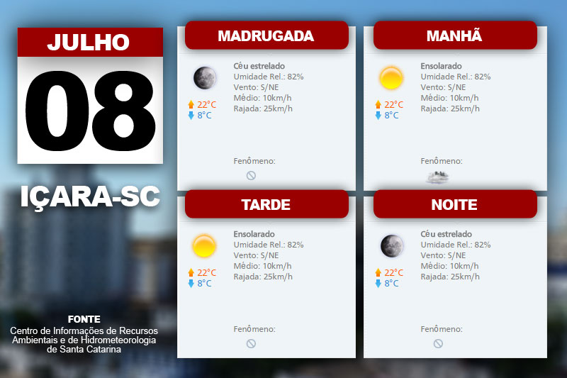 O tempo firme com nevoeiros ao amanhecer dá lugar ao Sol com poucas nuvens no decorrer do dia em todas as regiões catarinenses. Segue também a pequena elevação da temperatura. O Centro de Informações de Recursos Ambientais e de Hidrometeorologia de Santa Catarina indica ainda vento sul a nordeste, fraco a moderado.