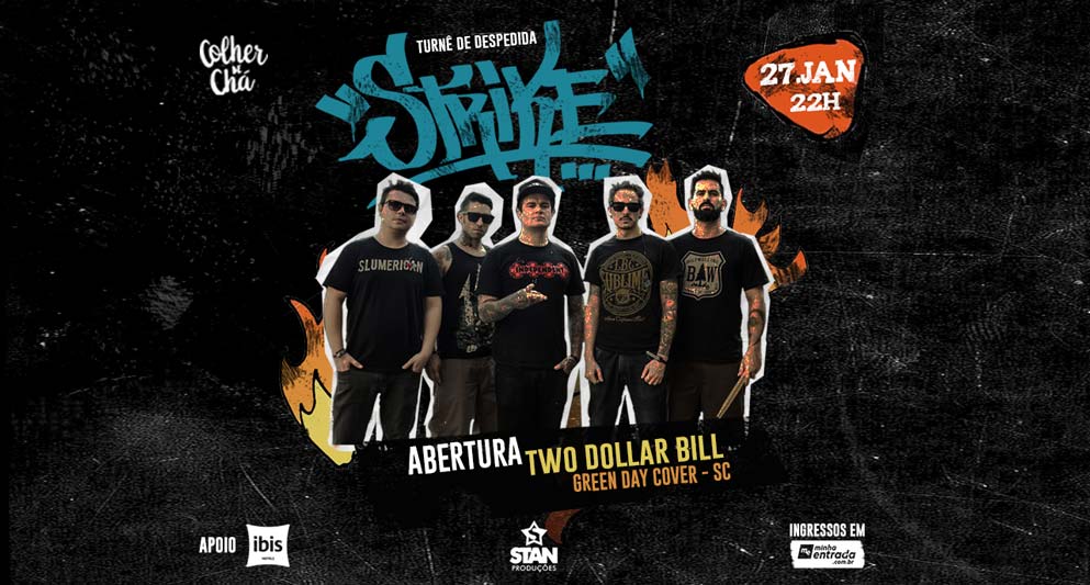 Uma das referências no Hardcore, Pop/Punk e do Rock Nacional vai se despedir dos fãs no Sul de Santa Catarina neste sábado, dia 27. Os clássicos que embalaram quase 15 anos de carreira da banda Strike serão apresentados no Colher de Chá, em Içara. Antes do show principal, terá ainda o cover do Greenday, Two Dollar Bill, de Florianópolis. O início do evento na casa de arte e cultura do bairro Presidente Vargas ocorrerá às 22h. Os ingressos estão disponíveis por R$ 30 na Loja Mury. O valor promocional inclui a doação de 1kg de alimento no dia do evento.