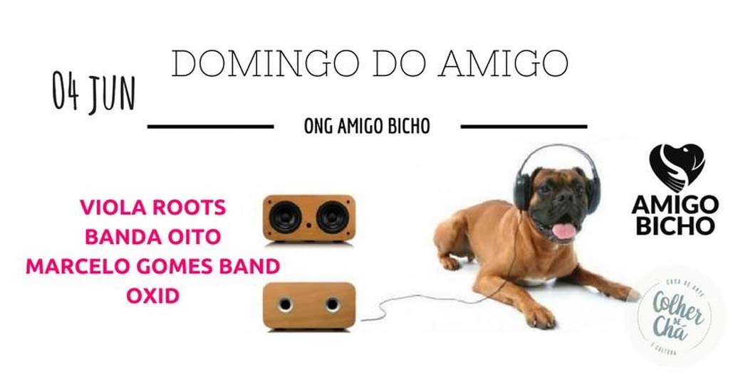 Pelos amigos bichos, a Viola Roots, Banda Oito, Marcelo Gomes Band e Oxid estarão unidos junto com a ONG Amigo Bicho neste próximo dia 4. O Domingo do Amigo acontecerá na Casa de Arte e Cultura Colher de Chá a partir das 16h. Os ingressos já podem ser adquiridos por R$ 10 com a entidade de proteção aos animais. Além disso, também estarão disponíveis na bilheteria, neste caso, com R$ 10 mais 1kg de ração para gatinhos ou cães.