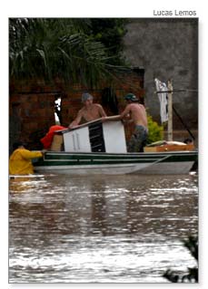 Equipamentos elétricos, roupas e móveis. Em Vila Nova, o que couber de objetos em um barco está sendo retirado das casas. Por volta das 6h desta quarta-feira, dia 12, algumas ruas começaram a alagar. E, já a tarde, estavam encobertas por quase 1,5 metros de água. Além de uma embarcação, caminhões de empresas da cidade auxiliam a transferência dos pertences. A retirada de moradores também ocorre desde o início do dia com o auxílio de uma patrola do Samae.