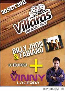O Villaras abre as portas novamente nesta sexta-feira, dia 30. E, para a última balada de setembro, apresenta três atrações. A festa terá Billy Jhon & Fabiano, Vinny Lacerda e DJ Edu Rosa. Os ingressos antecipados podem ser comprado em duas faixas de preço no Auto Posto Nicão, no Centro de Içara. Aos homens, custam R$ 20. Já para as mulheres, custam R$ 10.