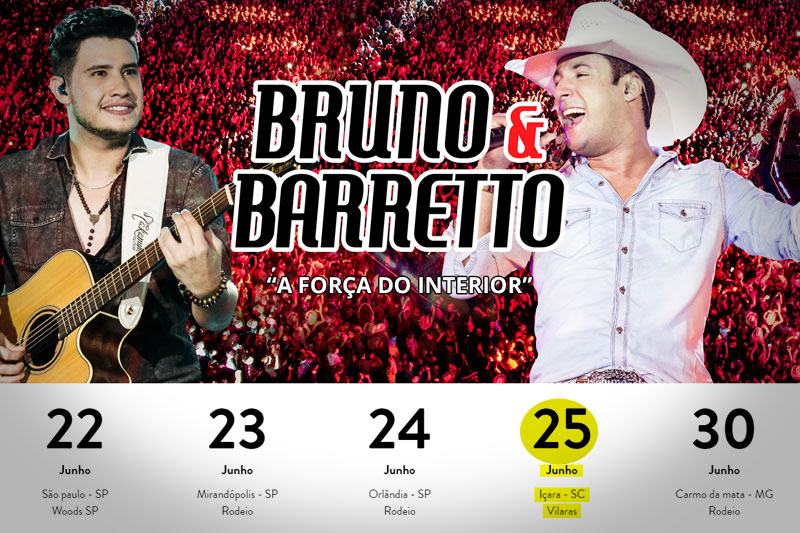 Após circular o país, Bruno & Barreto chegarão a Içara será neste próximo sábado, dia 25. O show nacional será a principal atração da comemoração dos cinco anos do Villaras. A festa na margem da Rodovia Deputado Paulino Búrigo (SC-445) terá ainda Dany e Rafa, Téo Abreu, Neguinho & Emanuel, Eufonia e Mannis a partir das 15h. Os ingressos já estão disponíveis, em Içara, na Loja Mury. O valor mínimo da pista é de R$ 50 no segundo lote.