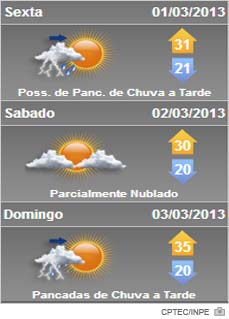 No sábado a previsão é de predomínio de Sol em Santa Catarina. Temperatura mais elevada durante o dia. Vento de leste a nordeste, fraco a moderado. No domingo, também Sol em SC, todavia, com mais nuvens e pancadas de chuva entre a tarde e noite devido ao calor e, principalmente na divisa com o RS. Isto devido à instabilidade provocada pela aproximação de uma nova frente fria.
