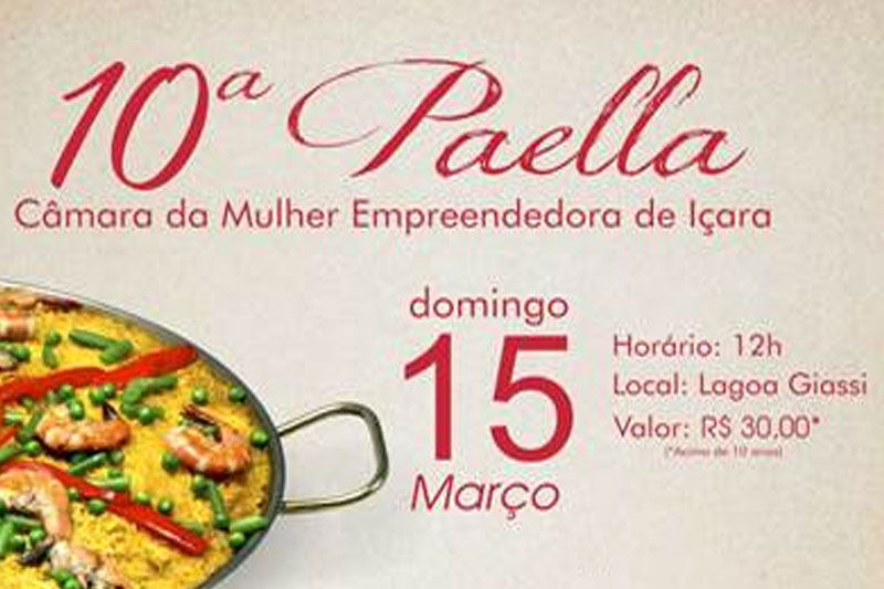 A Câmara da Mulher Empreendedora de Içara já tem ingressos disponíveis para a 10ª Paella Beneficente. Os bilhetes para o almoço podem ser adquiridos na Associação Empresarial de Içara e diretamente com as integrantes do núcleo feminino por R$ 30. O evento será dia 15 de março na Associação do Giassi, na Lagoa dos Esteves, em Balneário Rincão. A campanha deste ano acontecerá em benefício do Hospital de Olhos do Lions Club.