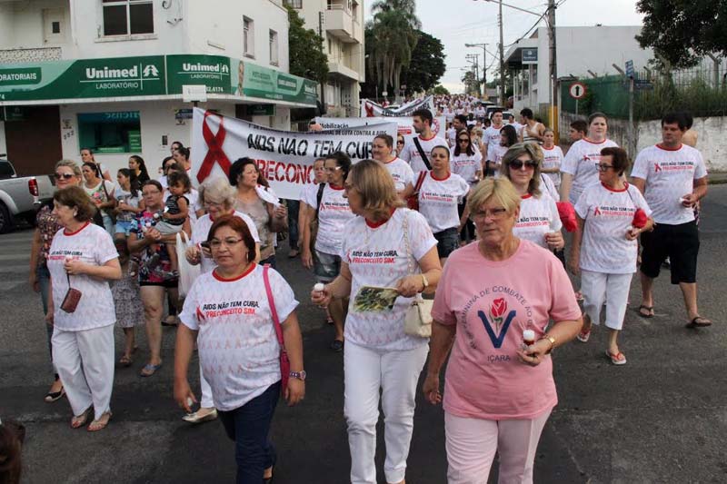 Camisetas e chinelos foram usados como forma de chamar a atenção para o Dia Mundial na Luta Contra a Aids em Içara. O material serviu de apoio na caminhada do Paço Municipal até a igreja Matriz São Donato nesta última segunda-feira, dia 1. O evento elaborado sob o tema “Aids não tem cura, preconceito tem” foi complementado ainda por uma missa, a partilha do bolo e a apresentação do coral Show Criança Feliz.