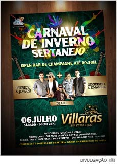 Além de ser no inverno, o Villaras vai promover um Carnaval alimentado por sertanejo. A festa no casarão do bairro Liri será neste próximo sábado, dia 6. Farão parte as duplas Patrick & Jovani, Neguinho & Emanuel, além do DJ Abu. Até os primeiros 30min de domingo terá também champagne liberado. Os ingressos já podem ser comprados antecipadamente por R$ 20 no Posto Chile e na Loja Mury. Para esquentar o fim de semana, a casa vai ter também festa nesta sexta-feira. Será com Léo Jr & Bruno, além de Benito de Lorenzi. Os ingressos igualmente estão à venda por R$ 20.