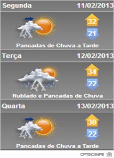 A segunda-feira é de tempo instável com nebulosidade variável e pancada de chuva isolada à tarde e noite, especialmente na divisa com os gaúchos. A previsão para terça-feira é de tempo instável com pancadas de chuva moderada a forte e descargas elétricas, do extremo Oeste ao Meio Oeste, pela manhã, e à tarde e noite em todas as regiões do Estado. Risco também de temporal localizado.