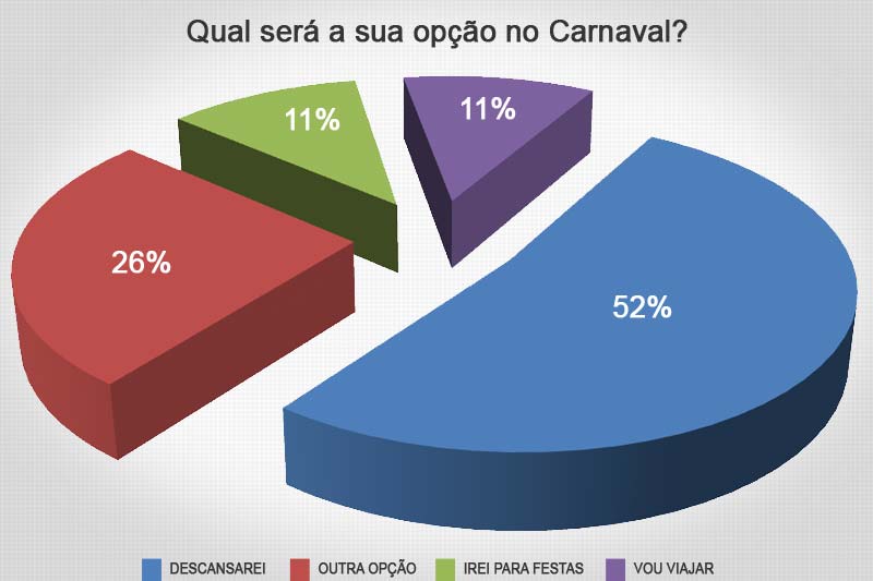 Qual será a sua opção no Carnaval? Ao todo, 52% dos participantes da enquete realizada pelo portal indicaram o descanso neste período. Outros 11% aproveitarão para viajar. Além disso, 11% também irão utilizar o maior evento popular brasileiro para festar. Entre os internautas, 26% farão alguma opção diferente. O questionamento foi respondido entre os dias e 2 e 9 de fevereiro por 27 votantes.