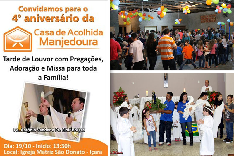 A Casa de Acolhida Manjedoura comemora neste domingo, 19, o 4º aniversário com uma tarde de louvor na Igreja Matriz São Donato. O evento inicia às 13h30 e contará com animação, pregações e missa para as famílias com os padres Antônio Vander e Eloir Borges. A Casa tem feito um grande trabalho de resgate e reintegração de muitos jovens que se perderam no vício das drogas.