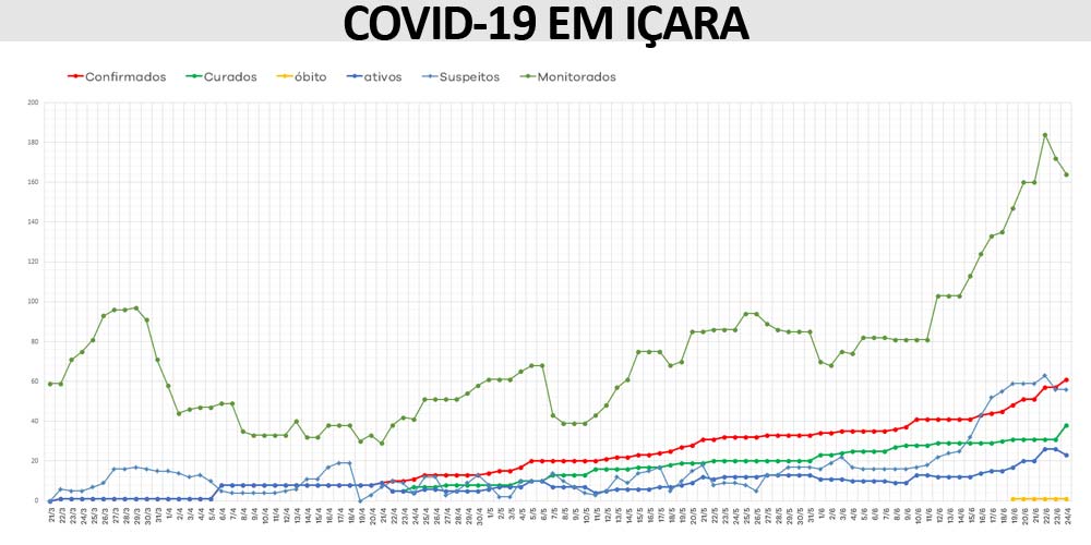 Dos casos em tratamento com covid-19, um deles está em terapia intensiva e 22 em tratamento domiciliar. O boletim epidemiológico indica ainda que 56 içarenses aguardam o resultado dos exames, dentre eles, 53 estão em isolamento domiciliar, dois em enfermaria, sendo um no Hospital São Donato, e há também uma pessoa em terapia intensiva fora da cidade. Os dados também apontam 164 pessoas sob monitoramento e um óbito.
