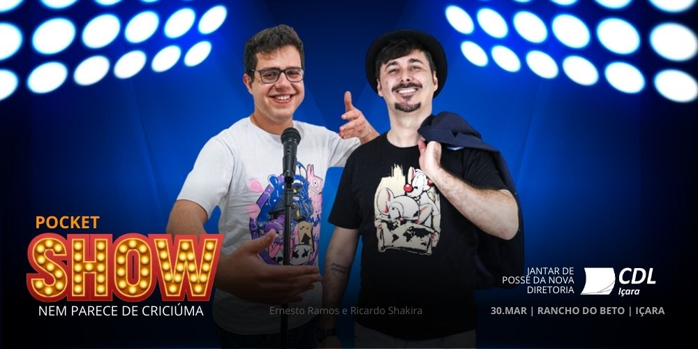 Ernesto Ramos e Ricardo Shakira vão protagonizar uma noite bem-humorada em Içara no próximo dia 30 de março. Integrantes do grupo de comédia Nem Parece de Criciúma, eles vão ocupar o palco do Rancho do Beto no jantar de posse da nova diretoria da Câmara de Dirigentes Lojistas. A primeira apresentação de stand-up na cidade acontecerá num pocket show a partir das 20h com ingressos, por R$ 50, adquiridos pelo telefone/WhatsApp (48) 99929-3314.