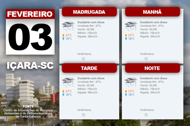 Céu encoberto e chuva ainda marcam esta quarta-feira no estado por causa de um cavado sobre o continente e sistema de baixa pressão no oceano. O Centro de Informações de Recursos Ambientais e de Hidrometeorologia de Santa Catarina aponta ainda temperatura amena, porém, permanência da sensação de ar abafado devido à alta umidade.