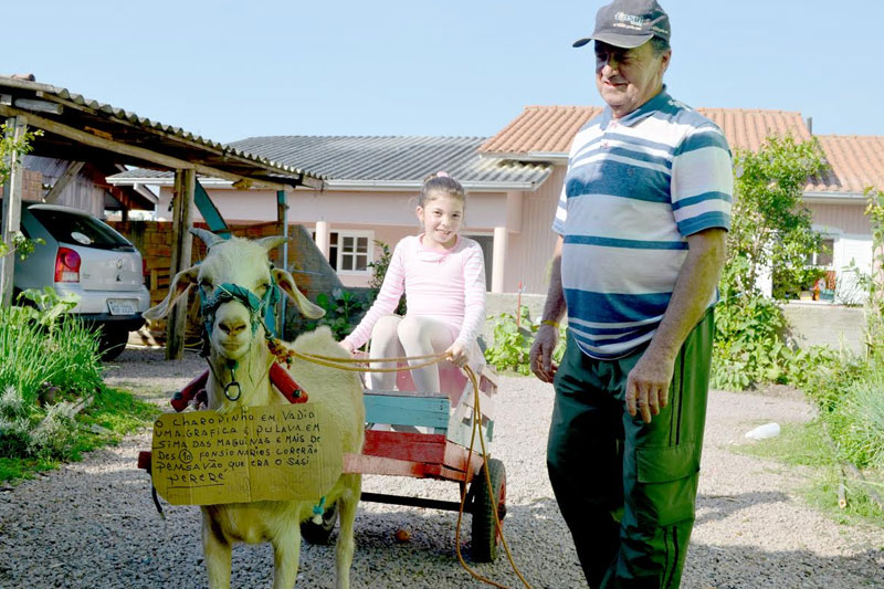 Cachorro, gato, passarinho, tartaruga e porquinho da índia. São várias as opções na hora de escolher um bichinho de estimação para criar em casa. Mas na residência de Antônio Calegari é diferente. Ele resolveu adotar um cabrito. Charopinho reside na propriedade há dois anos. Ele conta que o cabrito entrou para a família após um pedido insistente das netas, Sibely, de nove anos, e Mirely, de seis. “Comprei de um amigo que possui criação. As meninas ficaram felizes da vida”, conta satisfeito o aposentado de 65 anos.