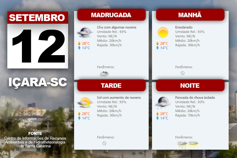 As nuvens aumentam no decorrer do dia nesta segunda-feira. Para o final da tarde e à noite estão previstas pancadas isoladas de chuva com trovoadas e temporais isolados em todas as regiões. O Centro de Informações de Recursos Ambientais e de Hidrometeorologia de Santa Catarina indica ainda temperatura em rápida elevação e acima de 30°C em algumas áreas catarinenses, além de vento fraco a moderado de nordeste a norte.