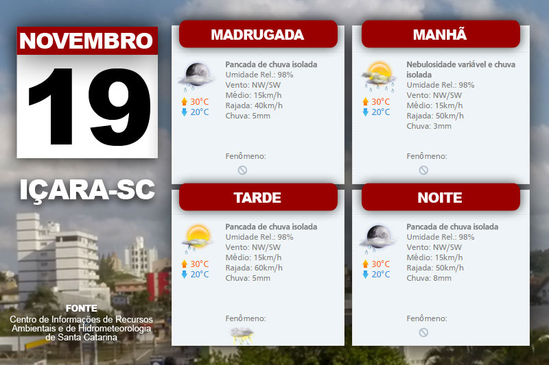 Pancadas de chuva e descarga elétrica ocorrem em todas as regiões devido à passagem de uma frente fria nesta quinta-feira. Ainda conforme o Centro de Informações de Recursos Ambientais e de Hidrometeorologia de Santa Catarina, a temperatura segue elevada. E nas áreas que fazem divisa com o Rio Grande do Sul há risco de temporal isolado.