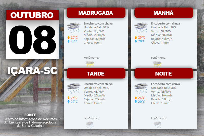 A chuva inicia pelo Oeste e Sul do estado devido ao avanço de uma frente fria nesta quinta-feira. Ao fim do dia a intensidade aumentará com risco de temporais isolados, ventania e granizo. "A temperatura ainda fica mais elevada na maioria das regiões com sensação de ar abado. Vento de nordeste a noroeste, fraco a moderado, com rajadas", indica a meteorologista do Centro de Informações de Recursos Ambientais e de Hidrometeorologia de Santa Catarina, Gilsânia Cruz.