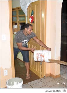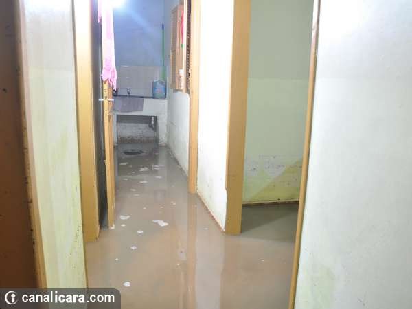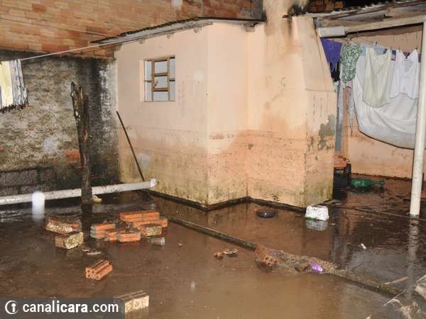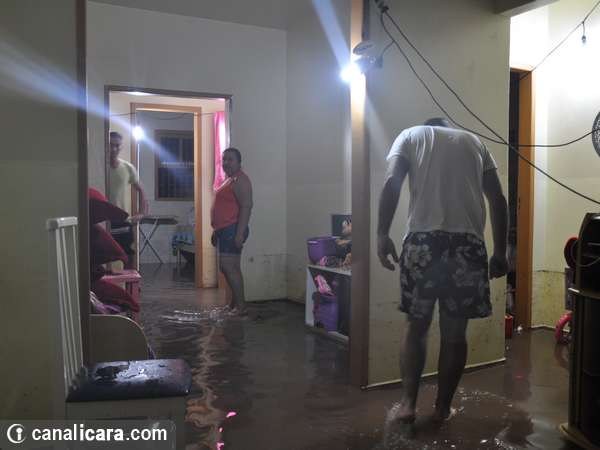 Já no interior da residência, o alagamento atingiu móveis e equipamentos eletrônicos que estavam numa altura inferior a 50cm. Por causa disso a energia precisou ser desligada. Para iluminar os cômodos foram instaladas então extensões puxadas na propriedade ao lado. Os vizinhos ajudaram ainda com o trabalho de remoção da água no terreno. Dentro de casa, o escoamento foi realizado com baldes e a drenagem pelo ralo do banheiro.