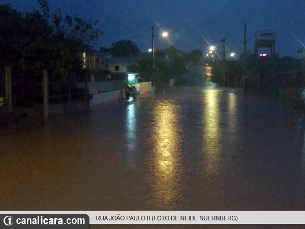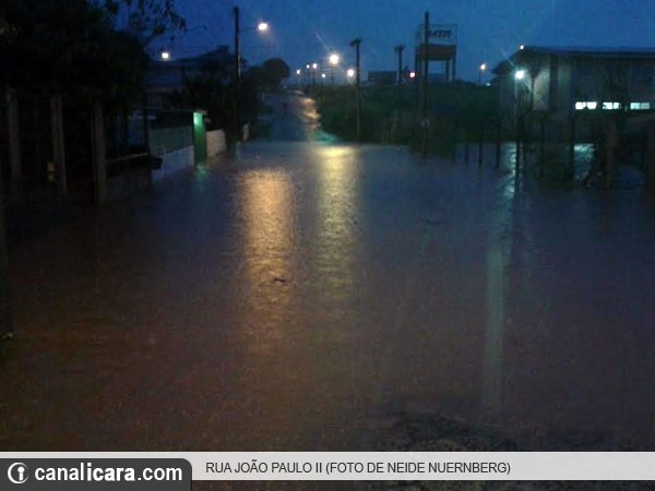 No bairro Presidente Vargas, a enxurrada provocou o alagamento da Rua Diomício Freitas na noite desta segunda-feira, dia 13. Com a passagem de veículos e a formação de ondas, a água ganhou força, provocou a queda do muro e invadiu também uma residência na esquina com a Rua Ignacio Stakowiski. Nos fundos do imóvel o volume chegou a mais de um metro. "A família passará a noite na casa de familiares", aponta o coordenador da Defesa Civil, Seloney Nascimento Carvalho.