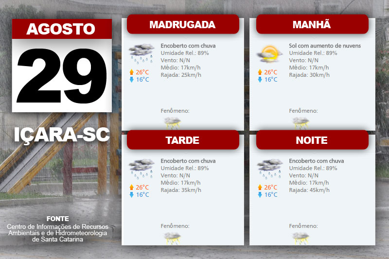 O céu encoberto representa chuva do Oeste ao Litoral Sul. No decorrer do dia, especialmente à tarde e noite, a chuva atinge as demais regiões. O Centro de Informações de Recursos Ambientais e de Hidrometeorologia de Santa Catarina indica ainda risco de temporal isolado com rajadas fortes de vento e granizo do Oeste ao Planalto Sul a qualquer hora do dia e nas demais regiões (especialmente no Planalto Norte e Alto Vale do Itajaí) a partir da tarde.