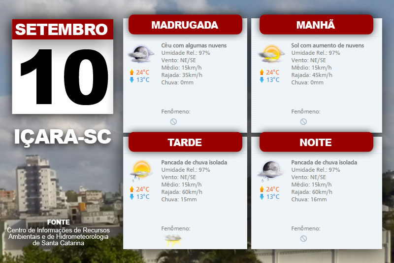 A nebulosidade aumenta no decorrer do dia desta quinta-feira. Dentre a tarde e noite, terá pancadas de chuva com risco de temporais (raios, rajadas intensas de vento e granizo) devido a uma frente fria deslocando-se do Rio Grande do Sul. “Temperatura em elevação. Vento de nordeste e sudeste, moderado, com rajadas intensas”, aponta ainda o meteorologista do Centro de Informações de Recursos Ambientais e de Hidrometeorologia de Santa Catarina, Marcelo Martins.