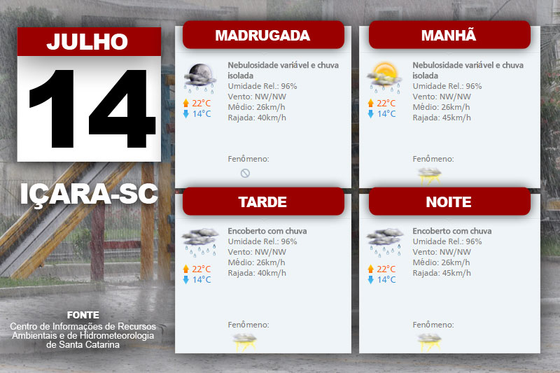 Há risco de pancadas de chuva moderadas com descarga elétrica do Oeste ao Litoral Sul. No decorrer da tarde a chuva ganha força do Oeste ao Planalto Sul e diminui no Vale do Itajaí, Planalto Norte, Litoral Norte e Grande Florianópolis. O Centro de Informações de Recursos Ambientais e de Hidrometeorologia de Santa Catarina indica ainda temperatura em elevação, além de vento noroeste, fraco a moderado.