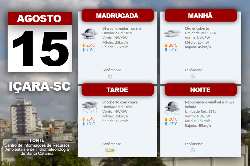 A chuva inicia com trovoadas pelo Oeste e Norte do estado até atingir as demais regiões no decorrer do dia. Devido a cobertura de nuvens a temperatura terá pequena elevação. O Centro de Informações de Recursos Ambientais e de Hidrometeorologia de Santa Catarina indica ainda vento com intensas rajadas noroeste a sudoeste.