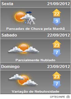 No sábado e domingo uma massa de ar seco e mais frio deixa o clima estável com Sol entre nuvens em Santa Catarina. Formação de geada no Planalto Sul, especialmente na região de São Joaquim. Temperatura baixa no período noturno com pouca elevação durante o dia.