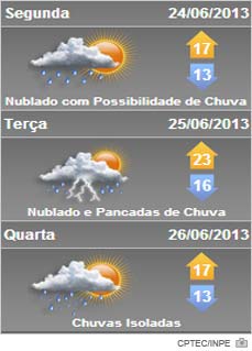 Durante a quarta, tempo instável com chuva isolada na madrugada e início da manhã. No decorrer da manhã uma massa de ar seco e frio avança pela Argentina, Uruguai e Sul do Brasil. Temperatura baixa na madrugada e início da manhã, com pouca elevação durante o dia. Vento de sudoeste e sul, fraco a moderado.