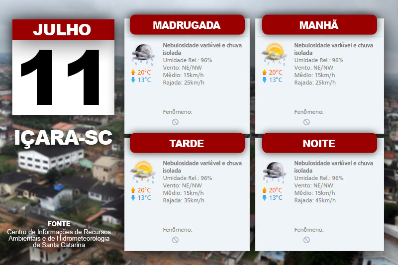 As nuvens predominam no estado com condições de chuva e trovoadas especialmente no centro-sul. O Centro de Informações de Recursos Ambientais e de Hidrometeorologia de Santa Catarina indica ainda temperatura em gradativa elevação, além de vento nordeste a noroeste, fraco a moderado, com rajadas no Litoral.